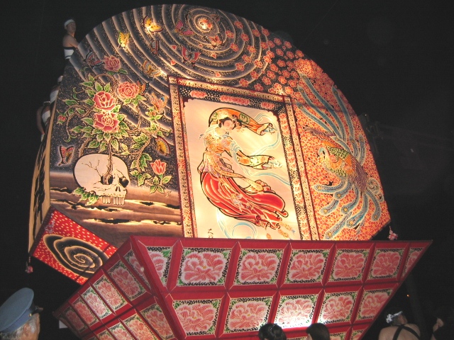 まず、ねぷた こちらは、弘前の祭りです。一般的に、形は扇形をしております。 ↓ こんなん 2006.08.05撮影 正面は勇ましい武将の絵です。