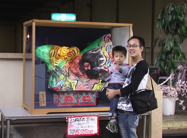 最初は『ねぶたの里』 予想どうり泣きましたY(>_<、)Y やっぱ、迫力あるもんね・・・(;`∀´) でも、五所の『たちねぷた』の時よりはおとなしかったよ♪ 太鼓の音を聞いたらご機嫌になりました(^ ε ^)o でもやっぱ近くに行くのは怖いのか、ちっこいねぶたの前でポーズ 写真見てビックリ( ゚д゚)ハッ! 売り物だったんだね・・・ しかも、¥15万7500って・・・(((( ;゚д゚)))アワワワワ だれが買うねん・・・(ー"ー ) ってか、売りもんの前で記念撮影したおらって・・・。・゚・(ノ∀`)σ{アホダ アホ丸出しでんがな(;゚;ж;゚; )ブッ しばらく館内歩いていると ( ゚д゚)ハッ! おもしろそなのハケーン…(`∀´人 ウヒヒ・ 息子に犠牲になってもらいやしたΣ(ノ∀`)ペチンッ なんか、隣のマネキン怖いじょ(゚Д゚;) 手無いし・・・ でもって、一番奥になぜか『弘前ねぷた』がありました( ̄~ ̄;)?? これに一番喜んでた息子です・・・ やっぱ君はりっぱな弘前っ子です((((((v´▽`)v ィェ‐ィ 『弘前ねぷた』の隣には、おっきい太鼓が(-_☆) 係員に聞く前に息子は (*゚Д゚) ムホムホ 叩いちゃいましたぁΣ(ノ∀`)ペチンッ ご機嫌な息子は『弘前ねぷた』のリズムで叩きやがんの~(;;゜∀;゜;;) ちょっと恥ずかしかった・・・(*--*) まぁ、今日はこんなもんです(;´Д`)ハァハァ その後、昼飯食うだけのために、『かやの茶屋』行ったとか、ここまで来たから城ヶ倉大橋渡ったとかは 疲れてて、記憶が定かでないですから・・・・・・ (;´Д`)ハァハァ (;´ Д`)ハァハァ (;´ Д `)ハァハァハァハァ :.` ;:.・∵ ゚ д:.` |
